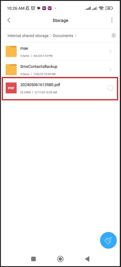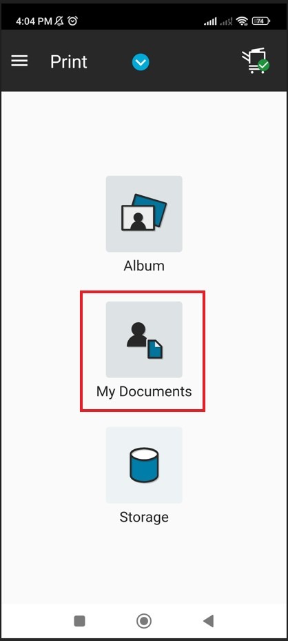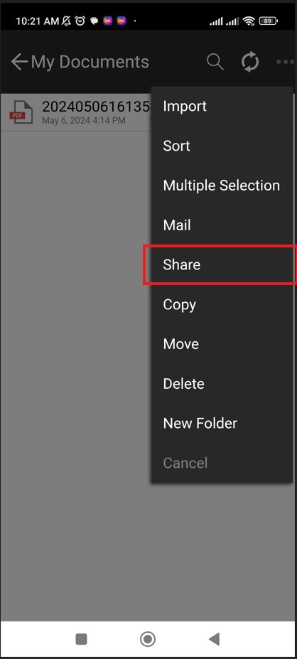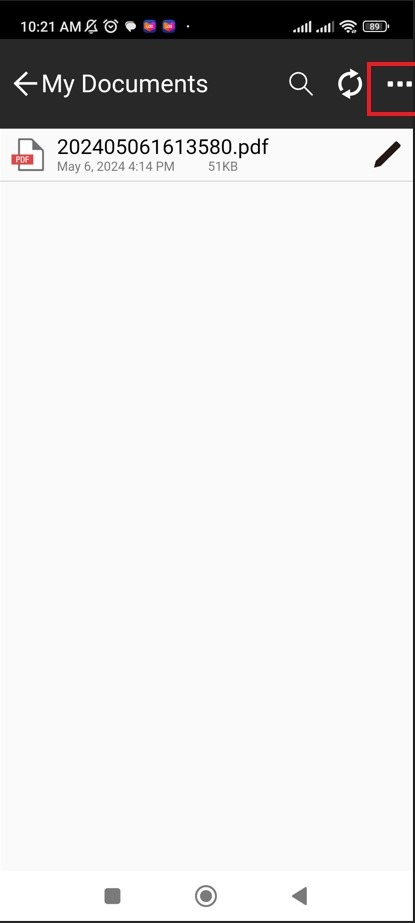STEP 1 – Select my documents from mobile print, the file that scan will appear, In order to save the scanned document to phone storage, select 3 dash on right hand corner then select [Share].