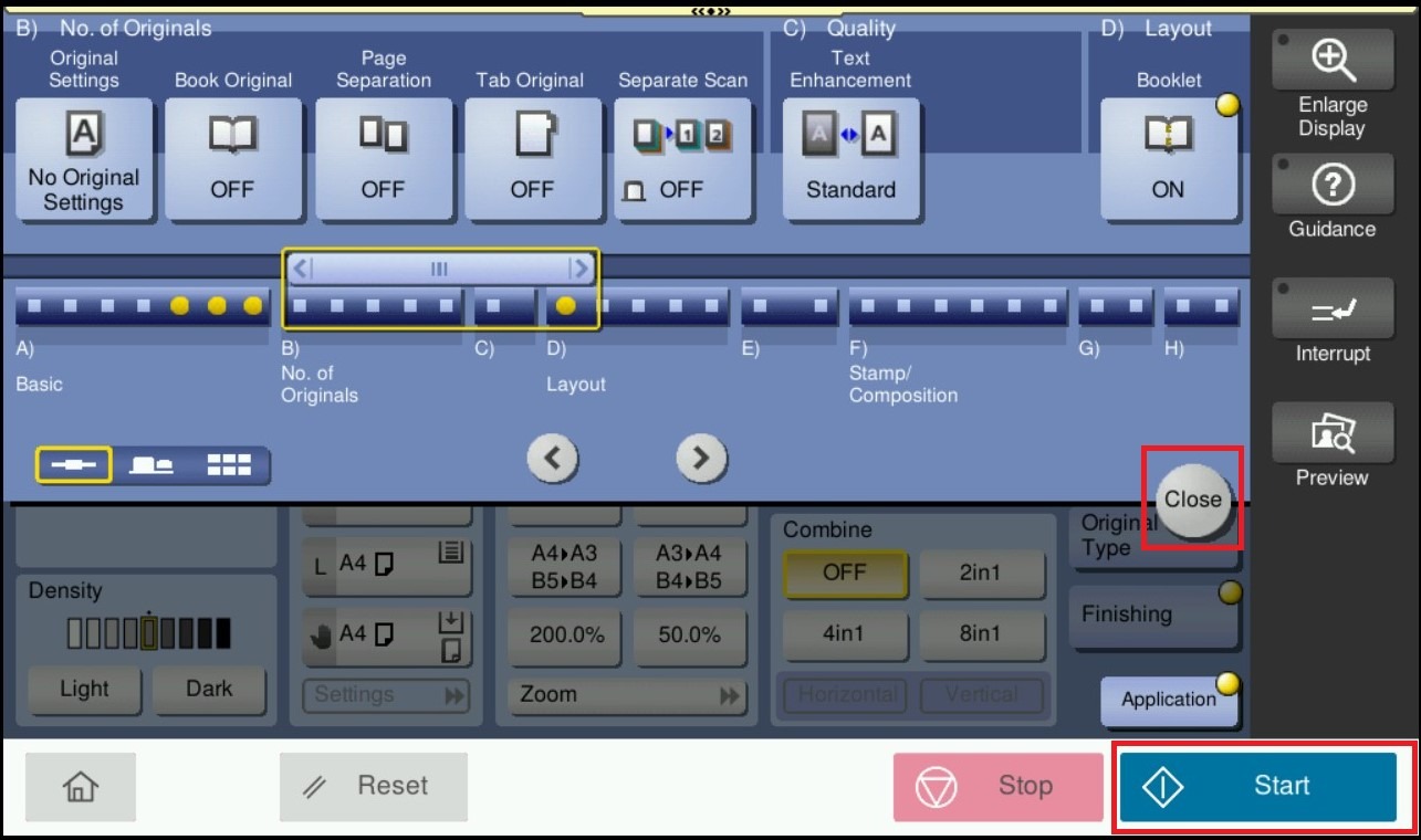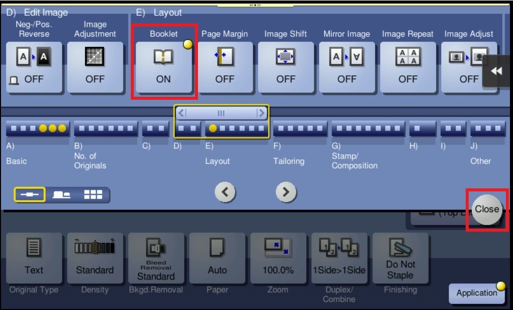 STEP 4 – After Adjust, click on [Close] to close the setting and start copying the original document into booklet format output.
