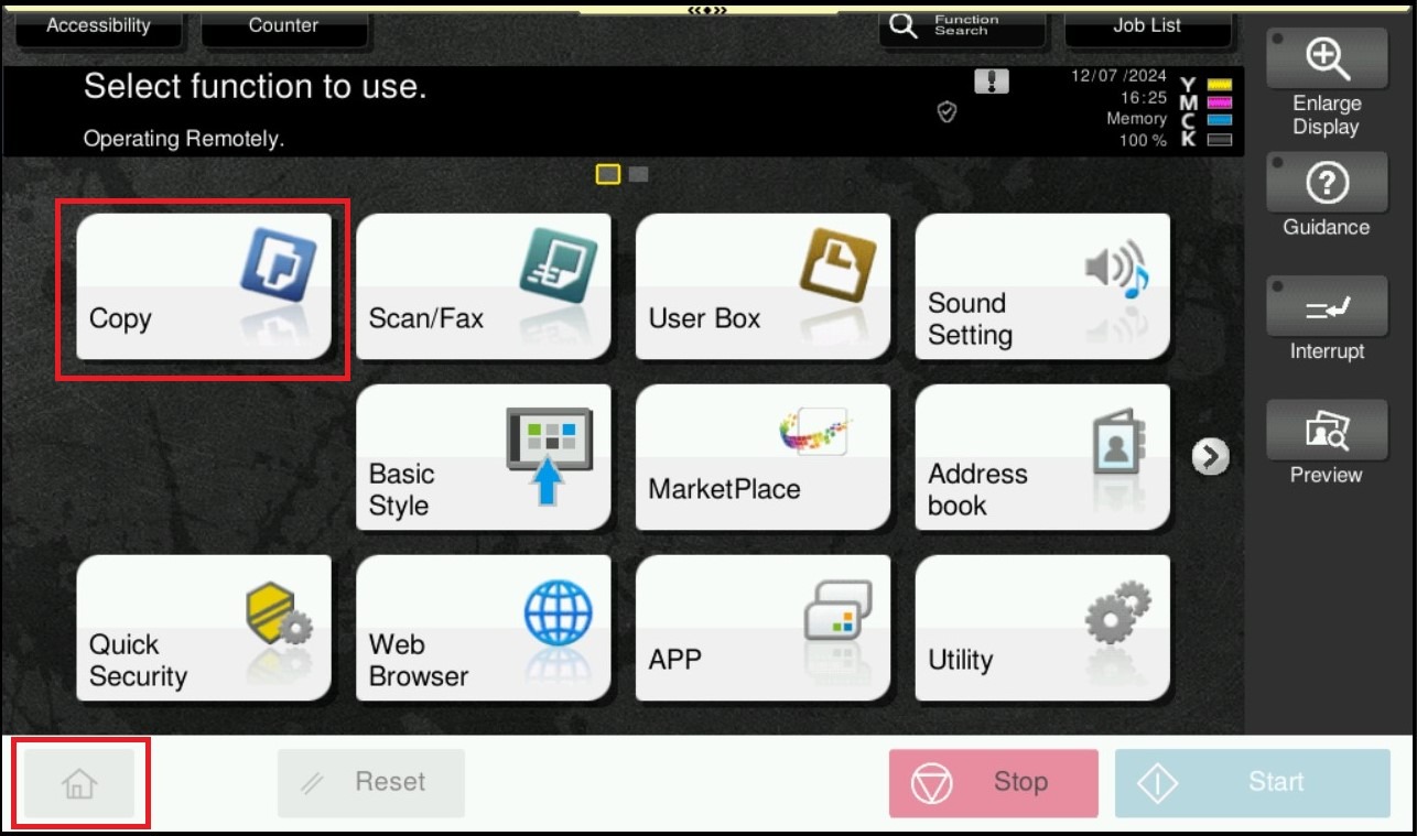 STEP 1 – On the Main Menu Screen, select [Home] – [Copy].