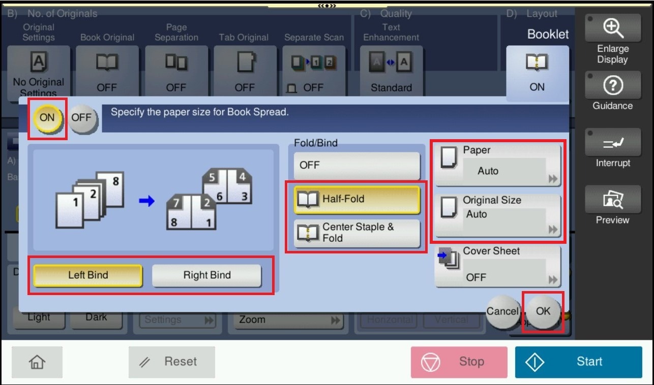 STEP 3 – Select [ON] to specify Booklet. Specify which function need to use, then click [OK] to save the settings.