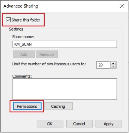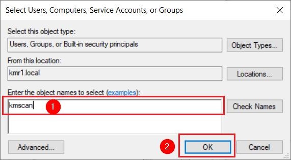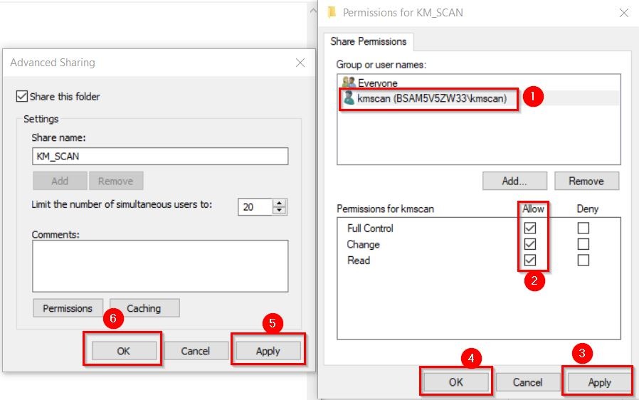 - [Tick] again on the allow full control under dummy username kmscan. Click on [Apply] and [OK] twice to save the changes.