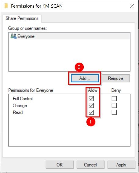 - Under the [Everyone] username, [Tick] on allow full control and click on [Add].
