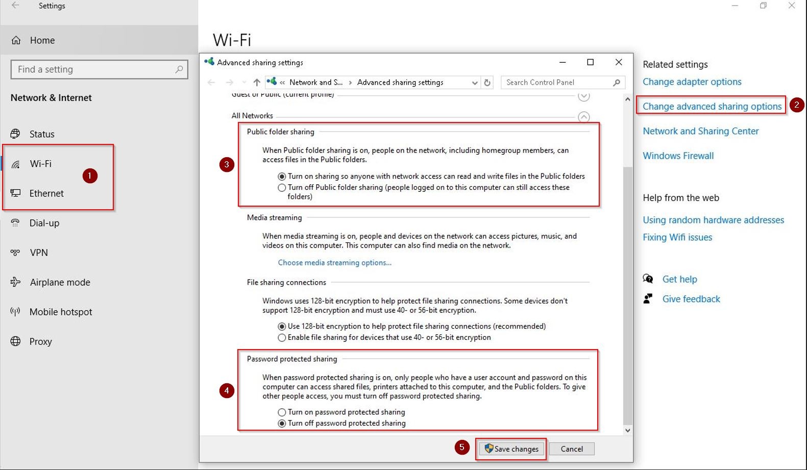 - Navigate to [Network & Internet] – [Ethernet] if connect via wired network or [Wi-Fi] if connect via wireless network – [Change Advanced sharing options].