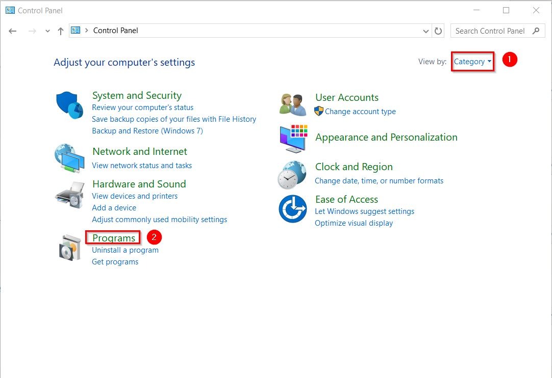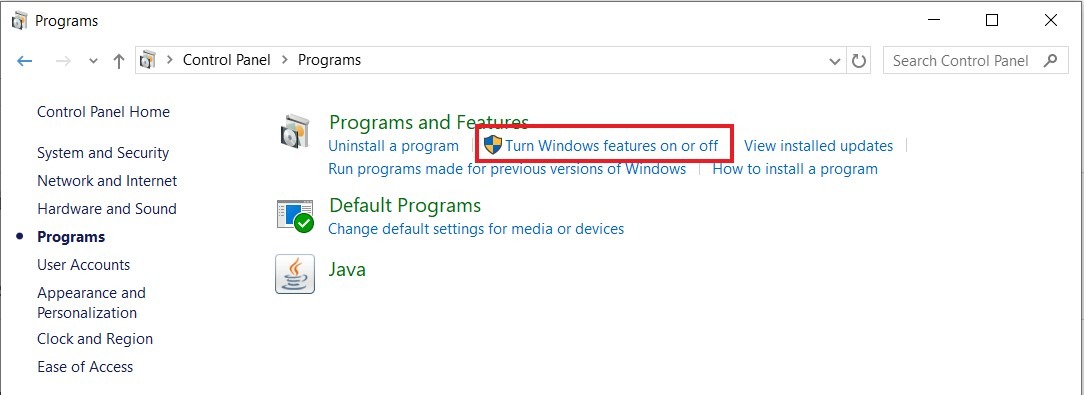 - Navigate to [Category] – [Programs] – [Turn Windows features on or off].