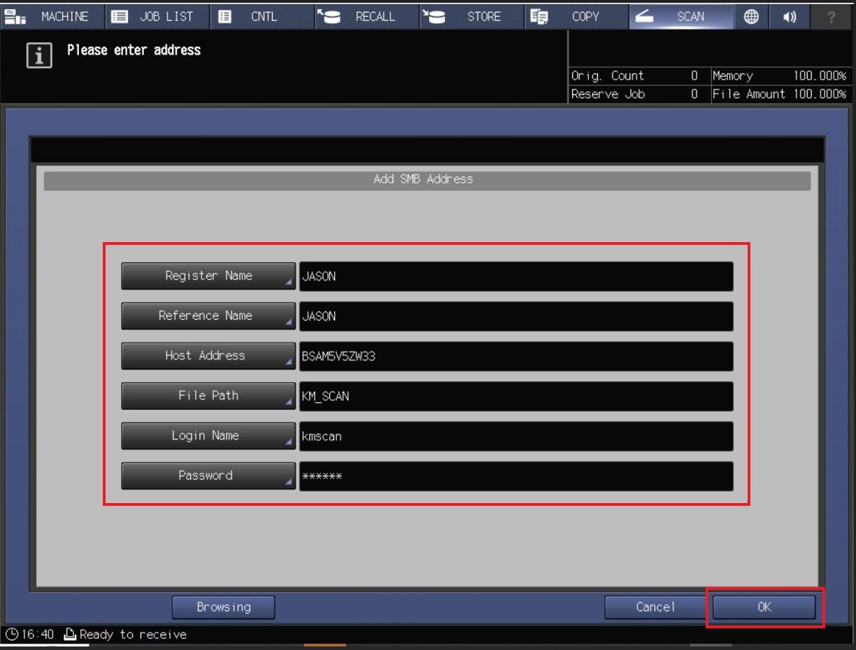 - Key in accordingly as per below. Click [OK] after finish to save the setting and you will be able to scan under SMB to PC/Laptop.