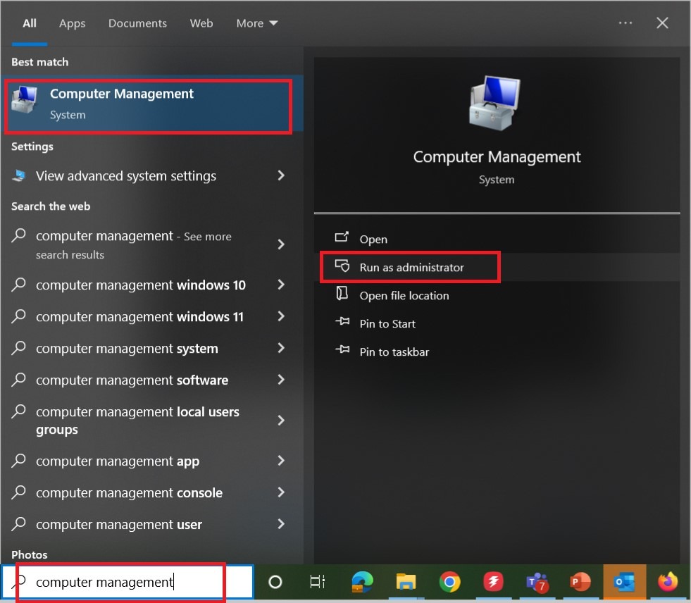- Go to search window, type [Computer Management] and click on [Run as Administrator].