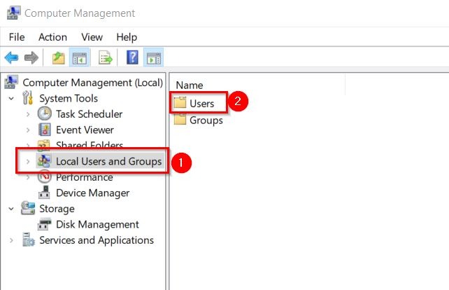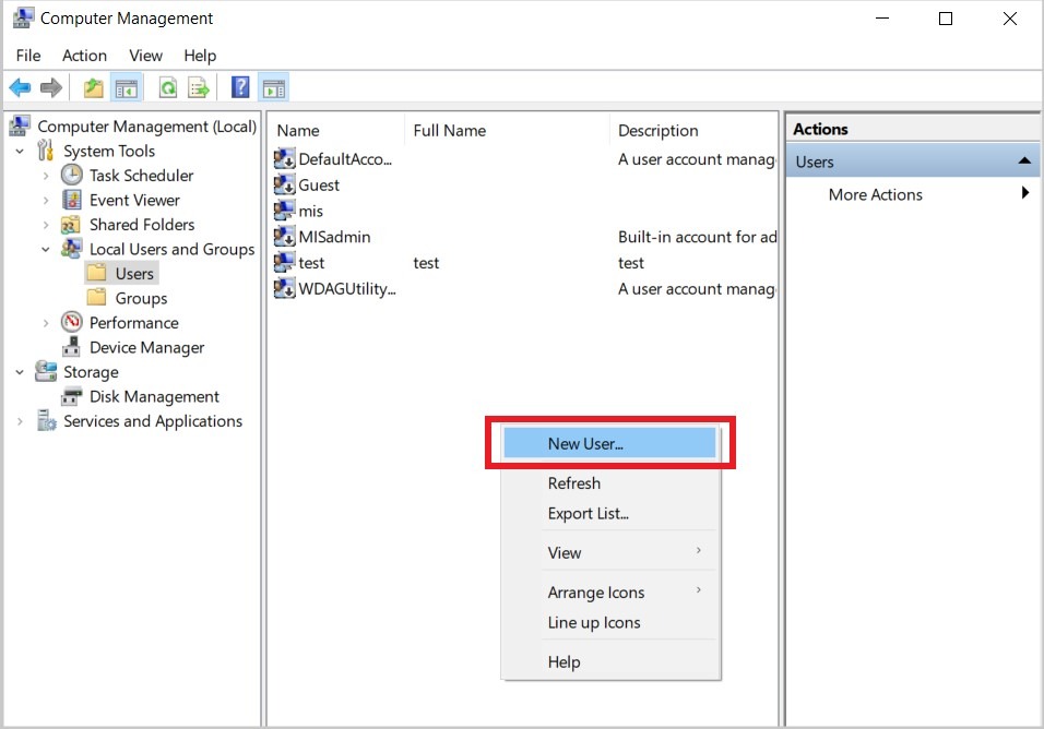 - On the left hand side, select [Local Users and Groups] – [Users]. Right click on the empty space and select [New User].