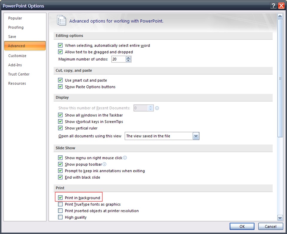 Issue when using Microsoft Office Application to print the application will hang and crash. In this case, kindly follow below guideline on how to disable the option “Print in background” in any of the Microsoft Office Application.