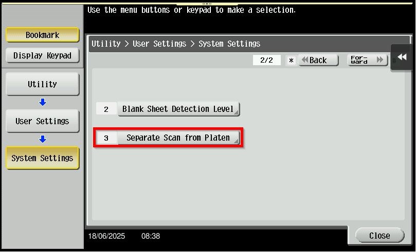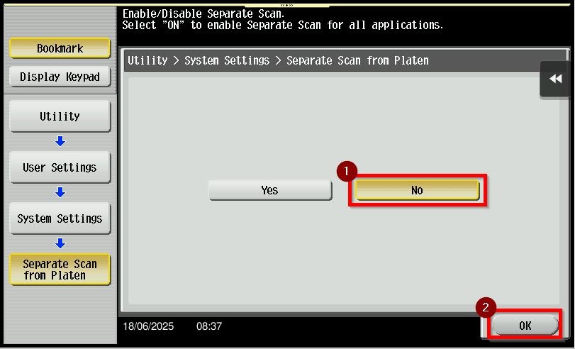 STEP 5 – Select [Separate Scan From Platen]  [NO] and click [OK] button to save.