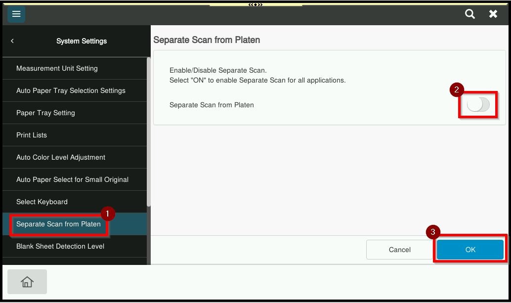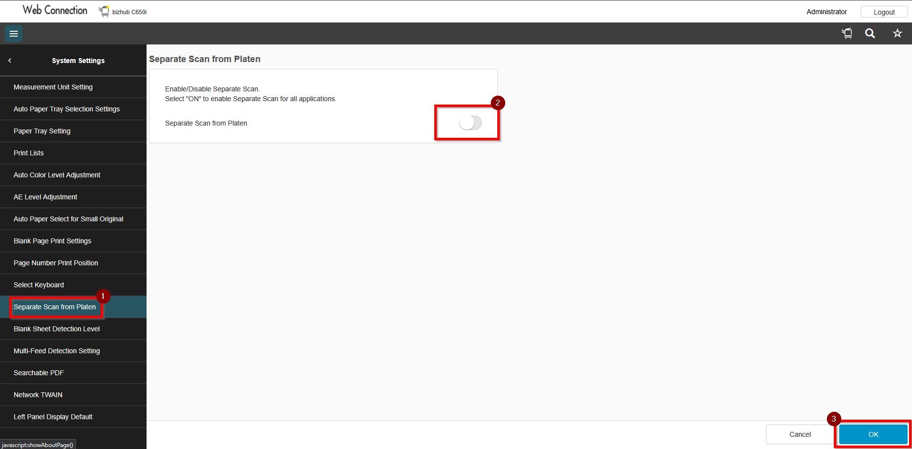 STEP 4 – Choose [Separate Scan From Platen], make sure the option is [Disable] and click on [OK] button to save.