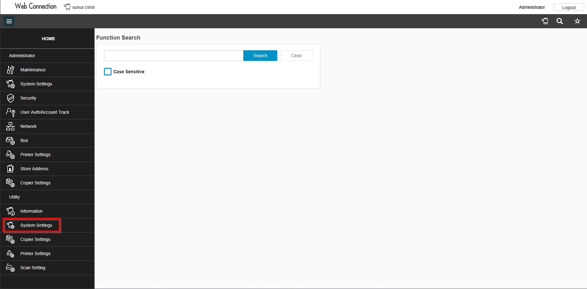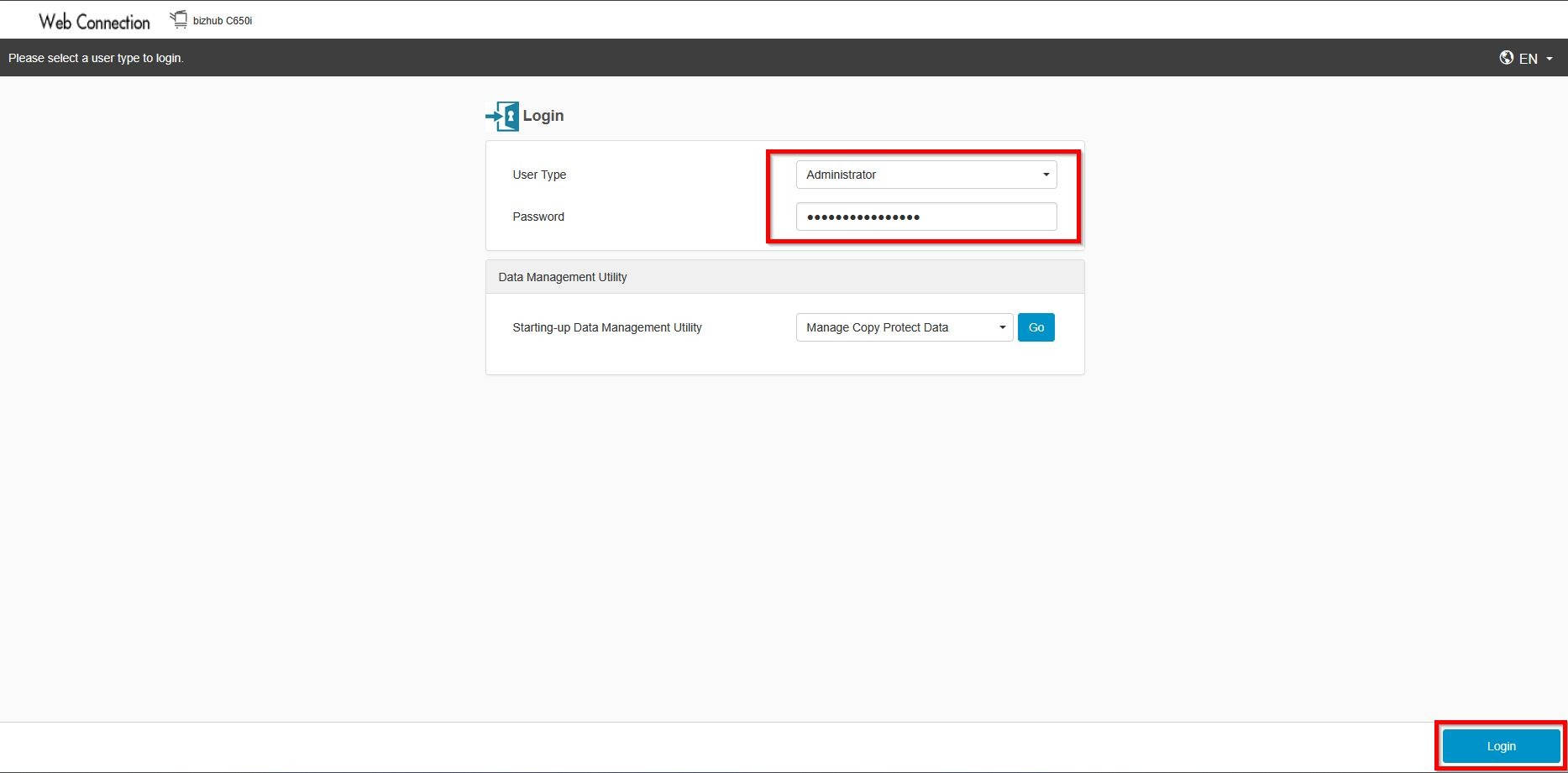 STEP 1 – Access to web connection via machine IP Address. Click on this to check how to get the IP Address from machine, then key in Konica Minolta Machine IP Address at web browser and log in as admin on the Web Connection.