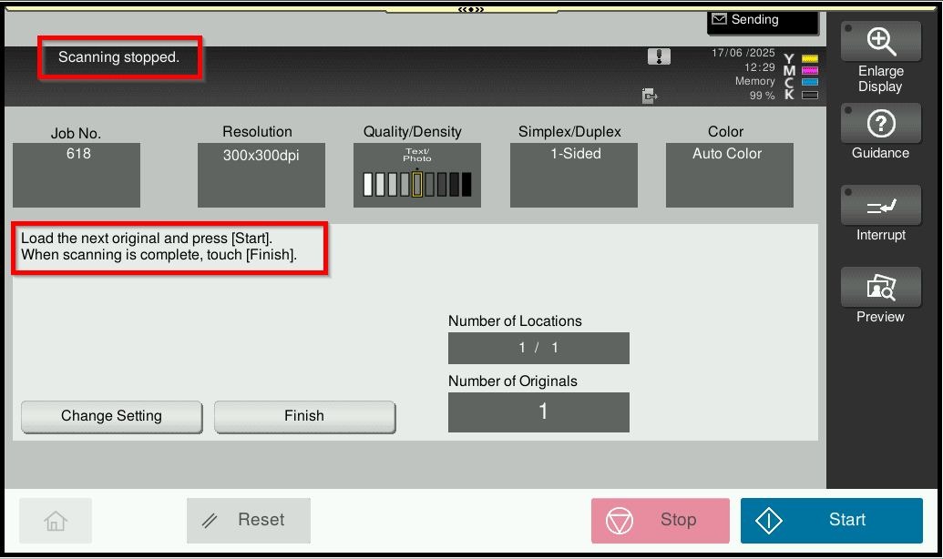 Example attachment showing scanning stopped when scan using glass on the photocopier machine while the option separate scan is turn off.