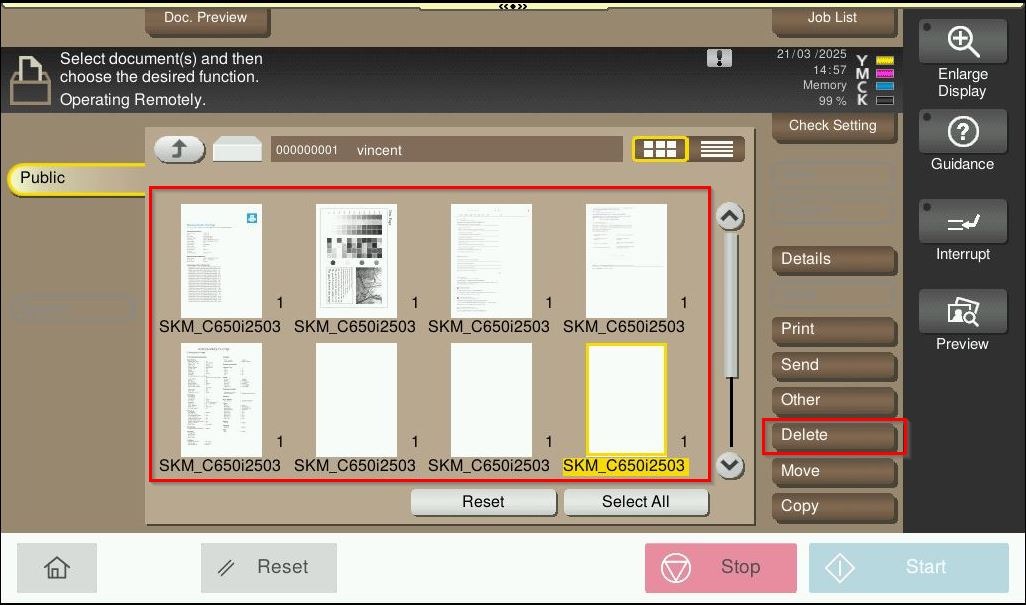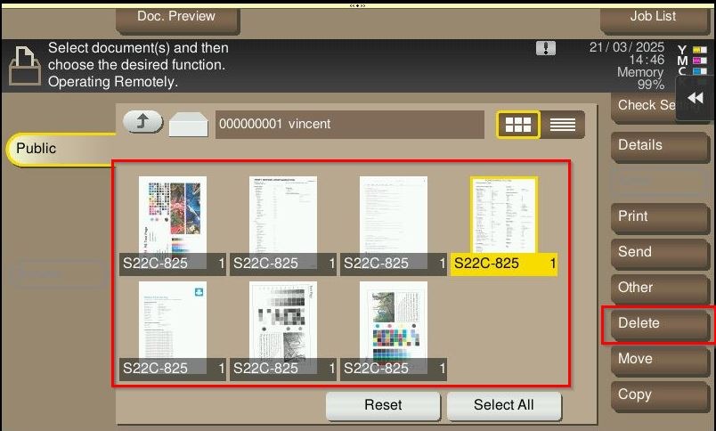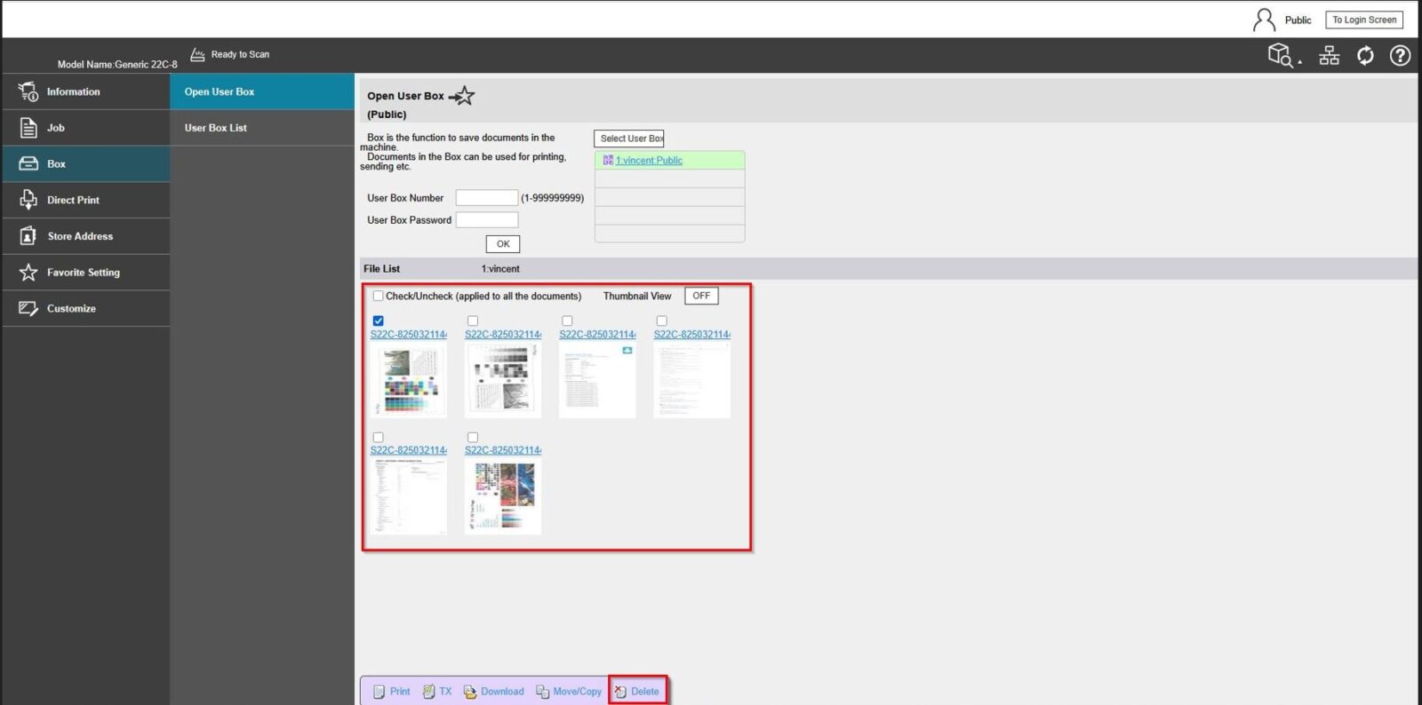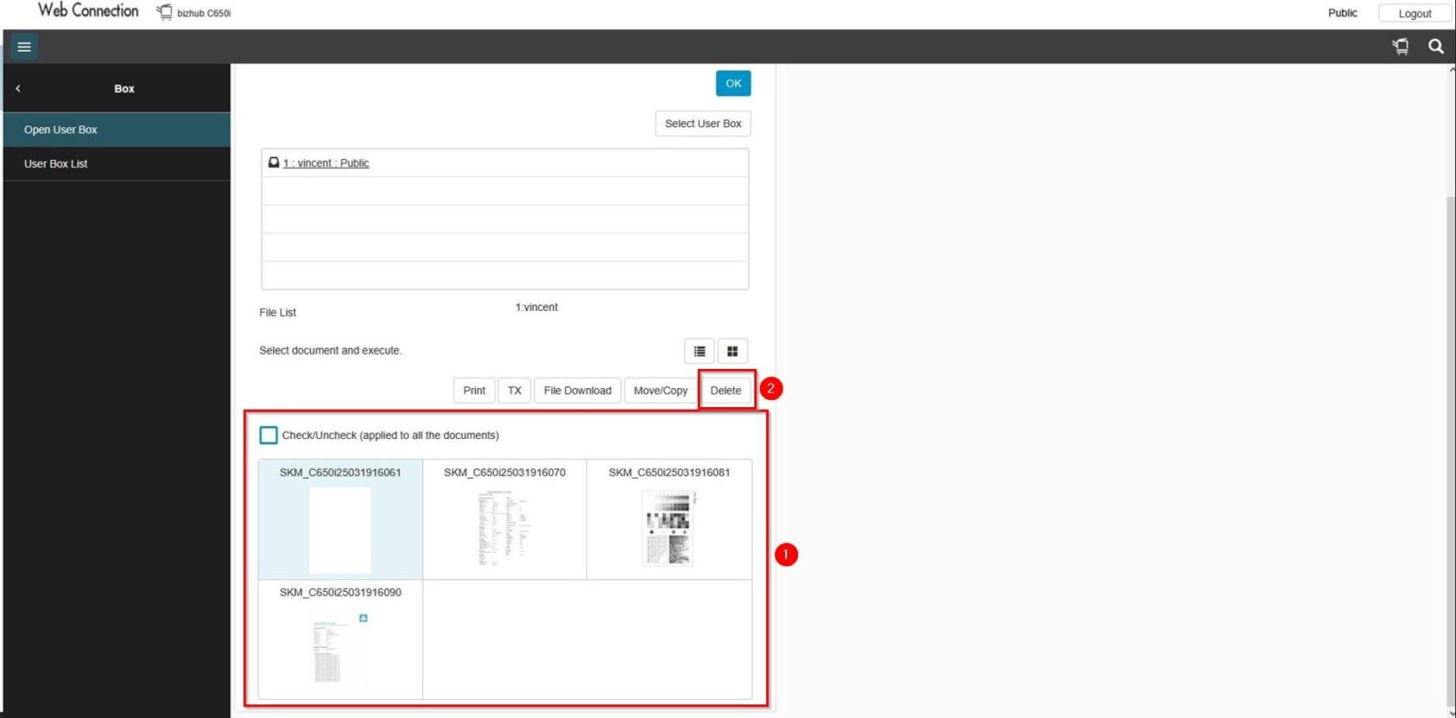 By default, the machine able to store the scanned document on the user box. However in some situation, scanning to user box may failed and an error occur stating that the error the number of documents in the box has reached the maximum limit. This error indicate that the user box documents is full. In such cases, it is necessary to clear out and empty the scanned documents on the user box. Kindly follow the step below on how to clear out the scanned documents either on the machine or via the web connection.