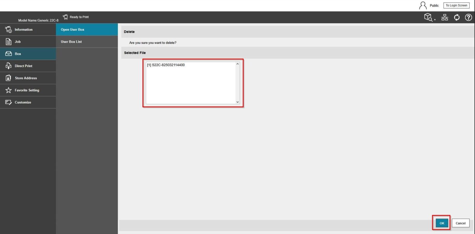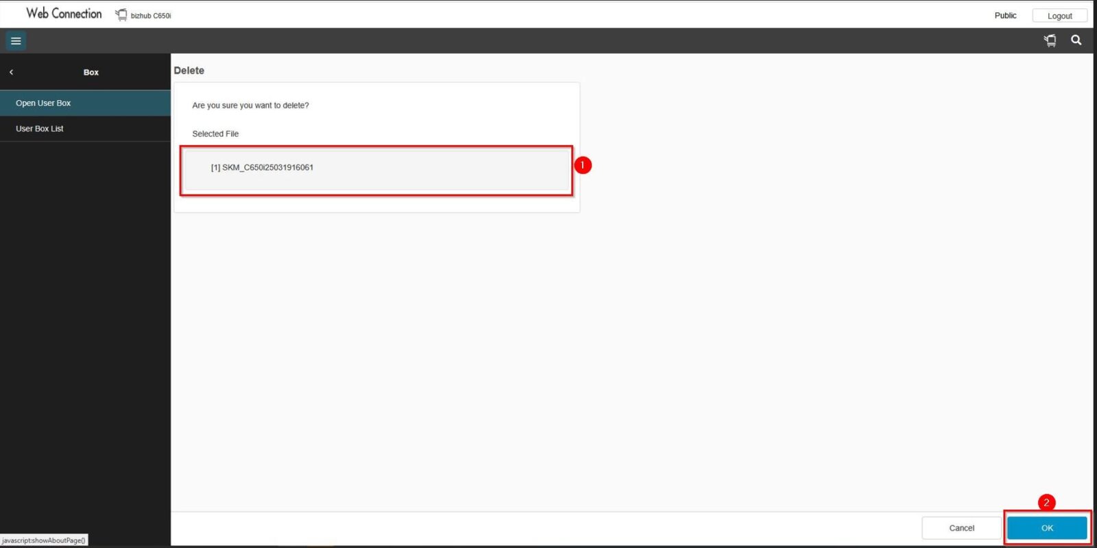 STEP 2 – Select [Box] – [Open User Box] – [Select User Box], then click on the user box name and proceed to scanned document you wish to delete to free up user box space.