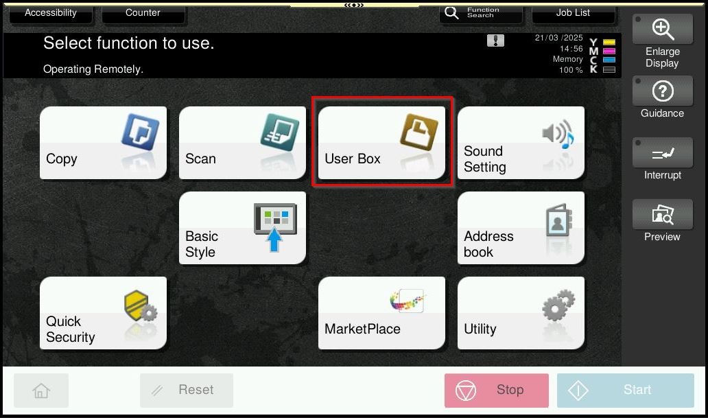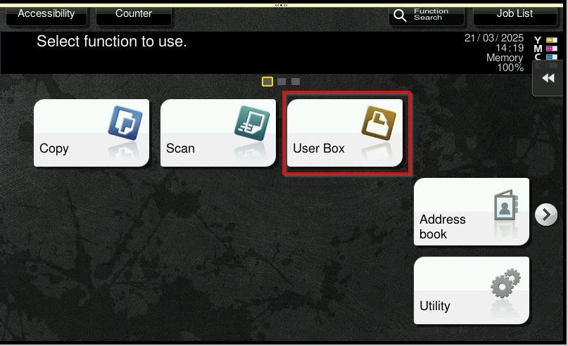 STEP 1 – On the Konica Minolta machine, select [User Box].