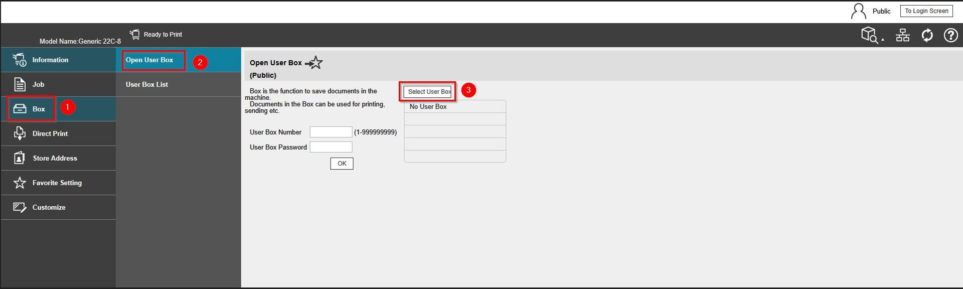 STEP 2 – Select [Box] – [Open User Box] – [Select User Box].