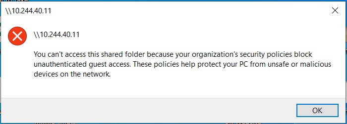 Guide on how to resolved the issue unable to access the machine User Box folder because the of the error “Organization’s security policies block unauthenticated guest access”. This is for Windows PC only.