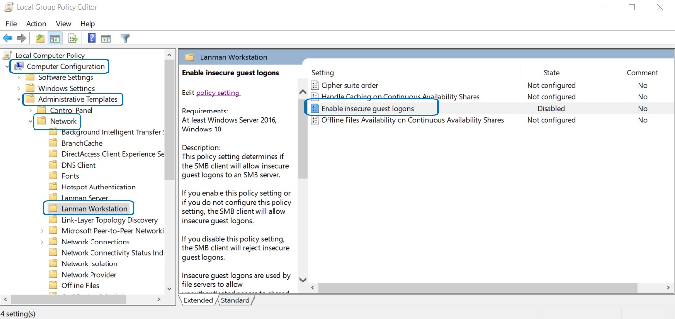 STEP 3 – Under Local Computer Policy, select Computer Configuration > Administrative Templates > Network > Lanman Workstation > Double click on Enable insecure guest logons.