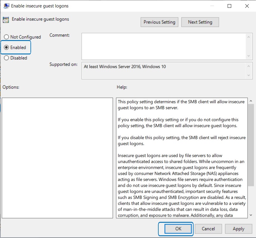 STEP 4 – Change from Disabled to Enabled and select OK to save the setting. It will solved the issue.