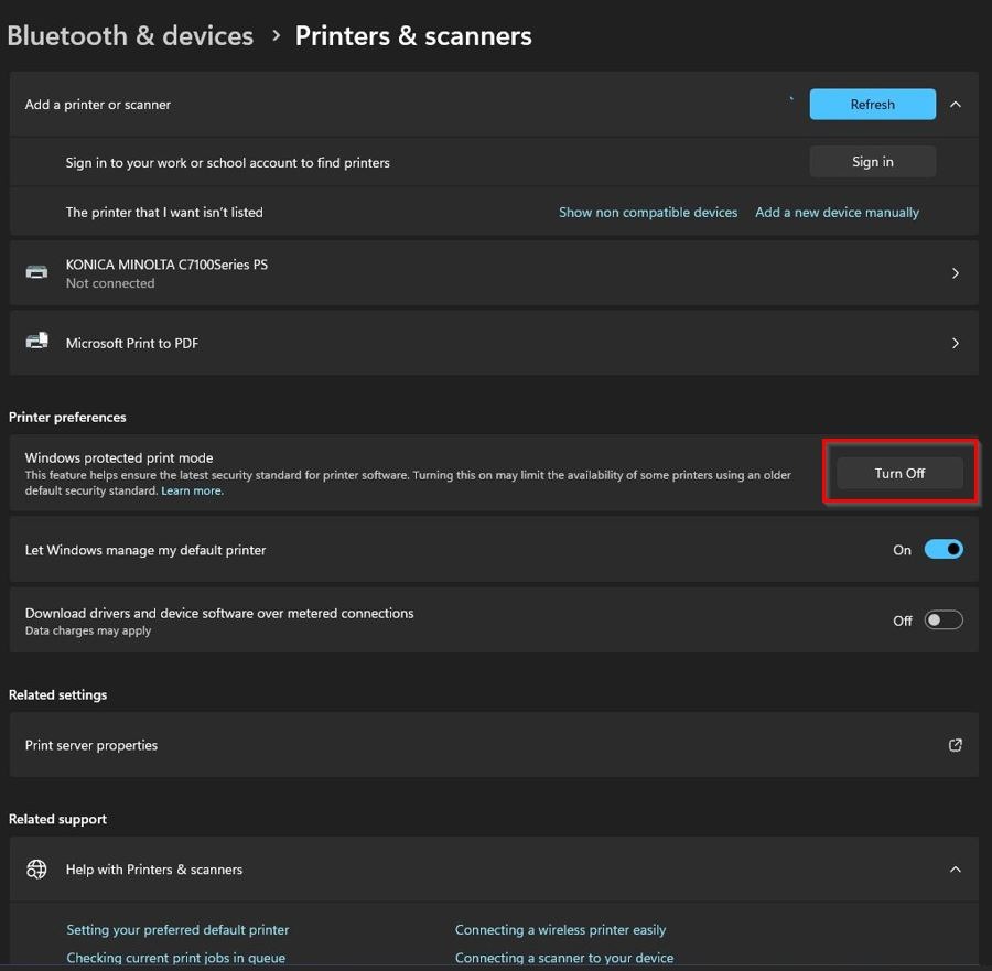 STEP 1 – Proceed to open the Windows [Settings], navigate to [Bluetooth & Devices] > [Printer & Scanners]. Under the Printer Preferences and select [Turn Off] the Windows Protected Print Mode (WPP).