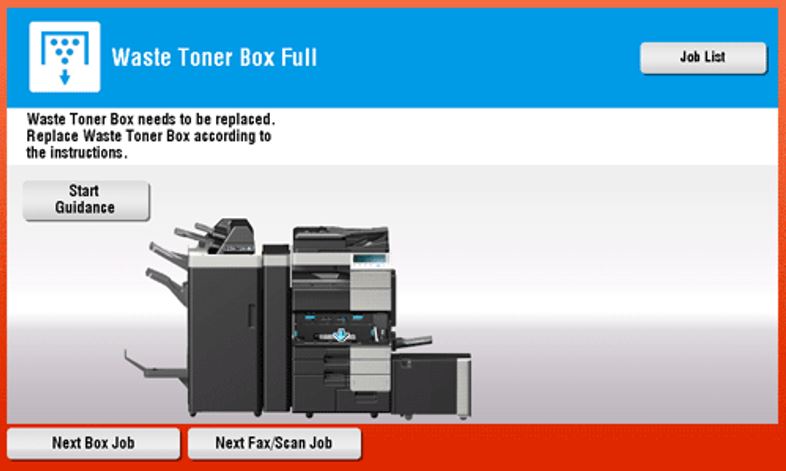 If the Waste Toner Bottle becomes full, this machine stops printing, and restarts printing after the Waste Toner Bottle is replaced. the following message appears (at replacement by the user). Tap [Start Guidance], then follow the displayed guidance to take action.