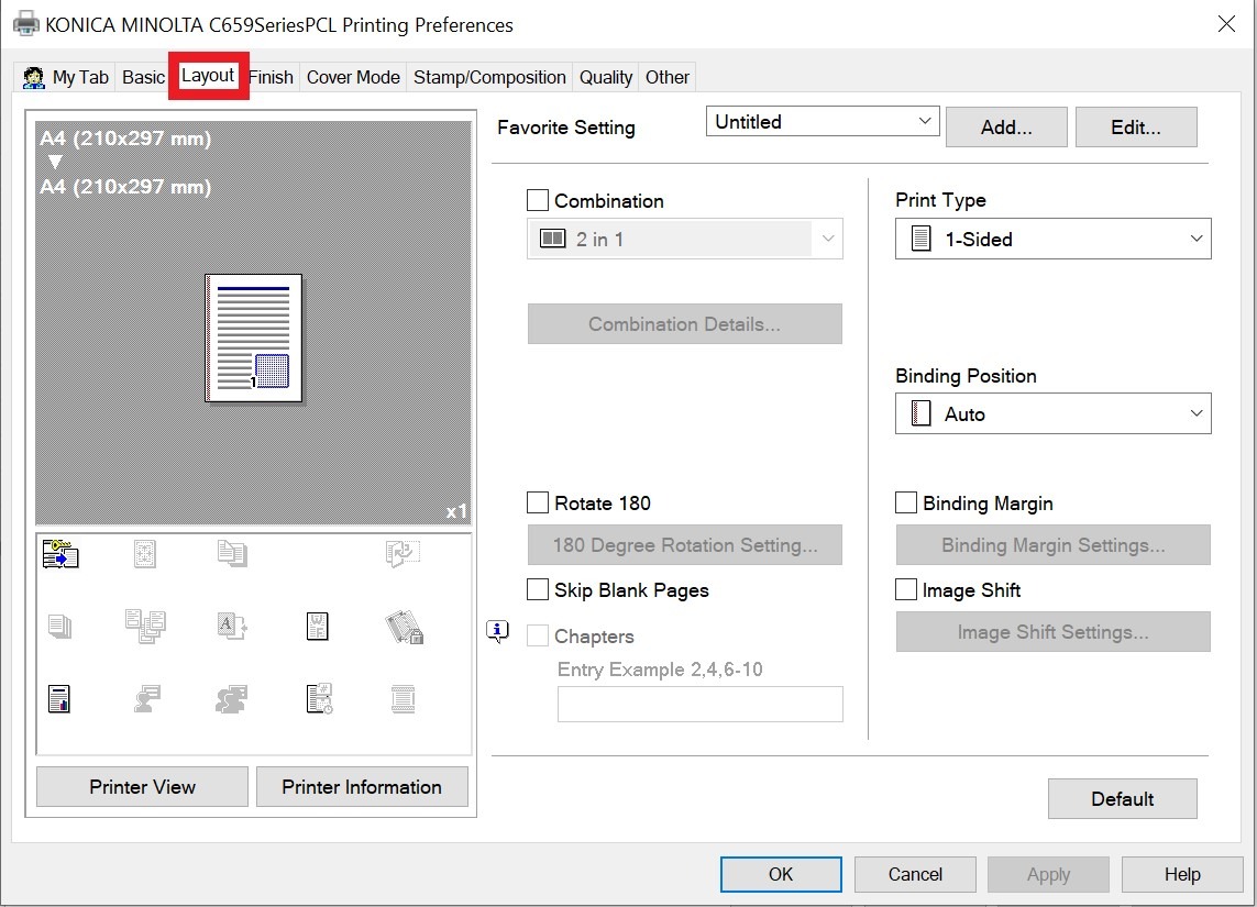 As per attachment below, the original print document is printed in A4 size, in order to enlarge the size and printed in multiple sheet, kindly follow below guide on how to configure the setting. [Note: Only applicable to PCL Printer Driver only]