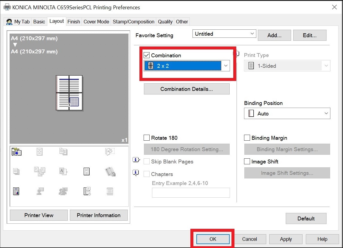 Step 2 – Select [Layout] – [Combination], select the combination that want to be printed out, may choose 2×2, 3×3 or 4×4 depending on requirement, then click [OK] to proceed for printing.