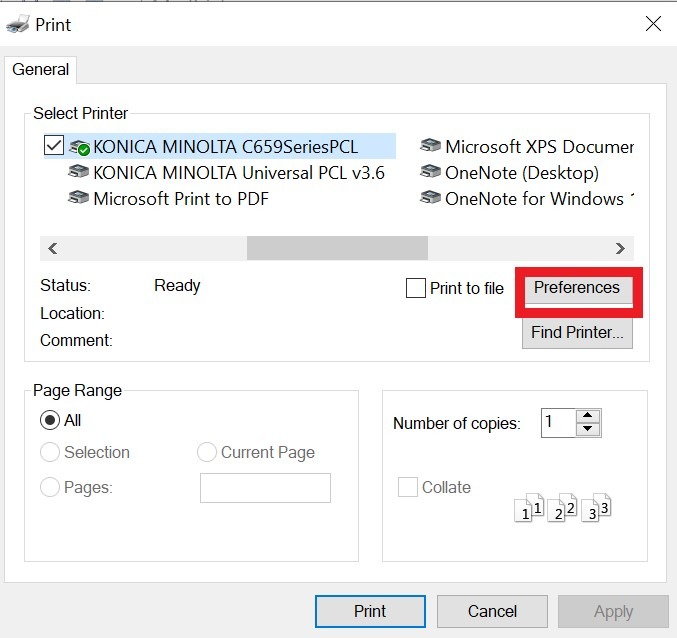Step 1(a) – Open a document or image that want to print, press [ctrl+shift+p] shortcut key (available on window 10 & below) or [ctrl+shift+p] – [More settings] shortcut key (available on window 11) , select [Preferences] under print option then proceed to step 2.