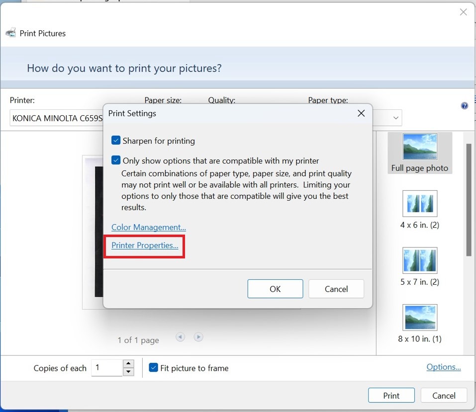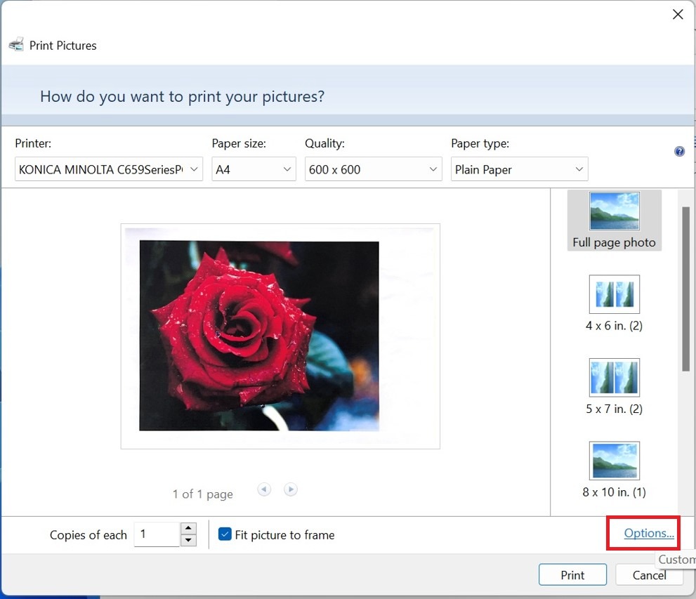 (Note: this option is not available in Windows Photos application as Windows photos application is using newer print dialog, in order to configure the printer setting before printing for those image that open in Windows Photos application, kindly follow next step 1(b) & step 1(c) before going to step 2.)