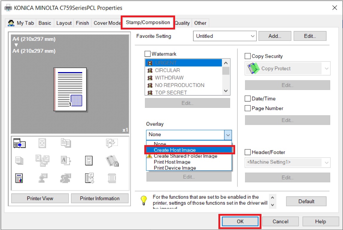Step 7 – Select [Stamp/Composition] tab – [Print Host Image] – [OK].